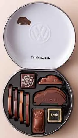 誕生日プレゼントでいただいたチョコレート。紙袋がVWだったので「?」と思いました。普通はゴディバとかピエールマルコリーニとかチョコ好きなら喜ぶ定番がありますが、なぜ自動車メーカー?と思って開けたら「TOOL KIT」と書いてあって、ますます「?」が増えてしまいました。さらに開けるとパッケージが工具箱。その中にビートルをかたどったチョコレートが入っていました。モロゾフがVWとコラボしたバレンタインデーキャンペーンのチョコでした。