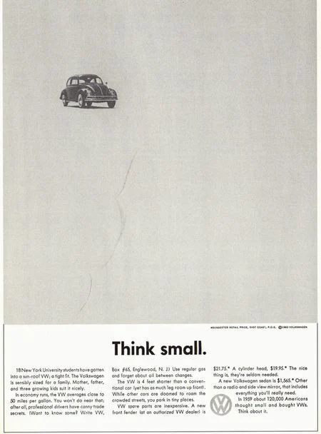 アメリカのVWが1959年から長年にわたって展開してきた広告シリーズで、シンプルなデザインとシンプルなキャッチコピー。商品の特長をきちんと伝える過不足のないボディコピー、品位を保ちながら親しみやすさもあり、まさにお手本とするに相応しい広告でした。特にボディコピー。新聞・雑誌広告がマイナーになってしまった今ではボディコピーなんてない広告が多いですが、昔のコピーライターの力量はボディコピーでこそ競われたものです。