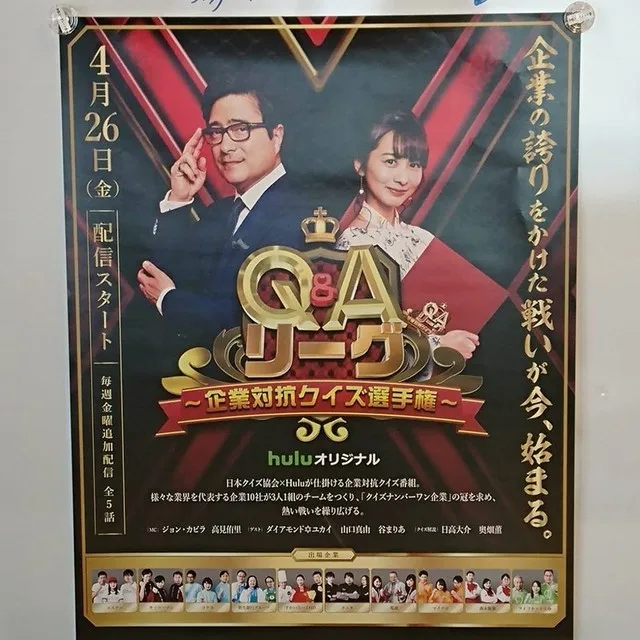 huluの「Q&Aリーグ~企業対抗クイズ選手権」のポスターが送られてきました。収録の時に告知用のスチール写真も撮影したのですが、その時はどういう風に使われるか、デザインも知らないままに撮影されましたが、なるほどこういうことかとわかりました。正直、かつてこういうポスターを作る仕事をしていた身としては、ちょっと型にはまり過ぎていて面白くないとは思うのですが、王道の告知用ポスターです。